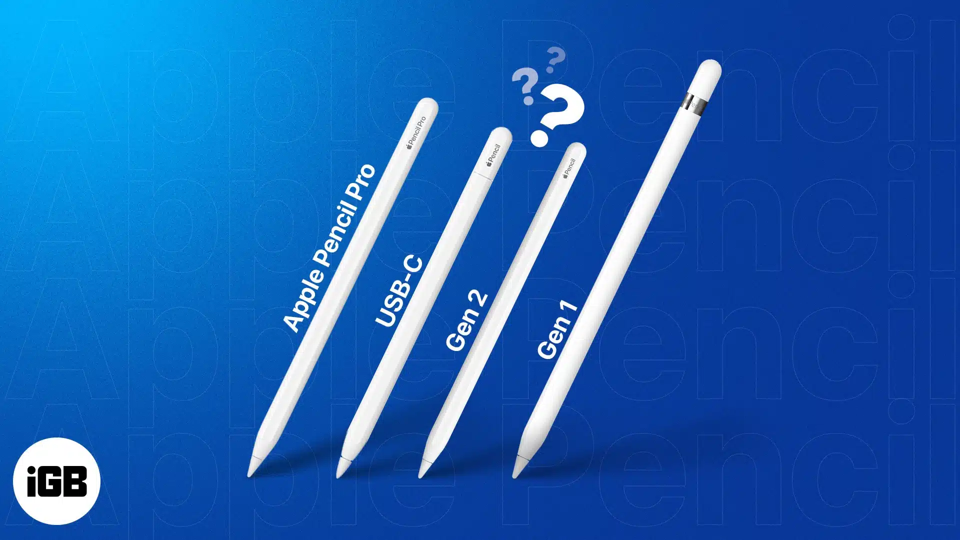| Apple Pencil Pro | Apple Pencil USB-C | Apple Pencil (2nd gen) | Apple Pencil (1st gen) | |
