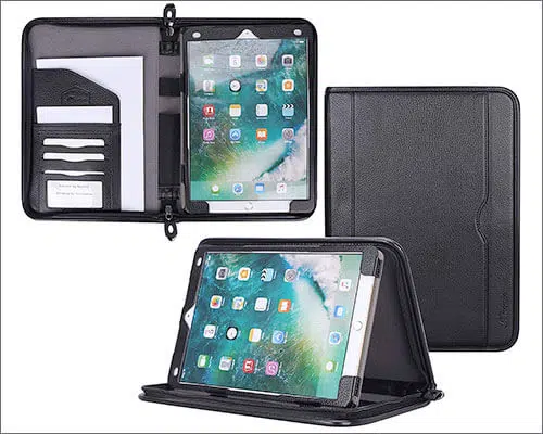 ProCase leather case for iPad Pro features four different colors and crafted from premium composition leather. A soft interior assures protection from scratches; also, it also has multiple slots to view on your iPad Pro with different angels. Other feature consists of magnetic closure and auto wake/sleep feature. Lastly, precise cuts give you access to all ports and functions quickly.
