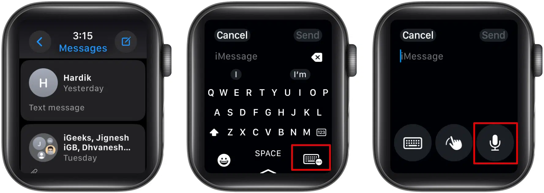 - When the keyboard appears, tap the keyboard icon in the bottom-right corner. Then, tap the mic icon to switch to Dictation mode. (In some Apple Watches, you will find the mic icon directly instead of the keyboard icon.)