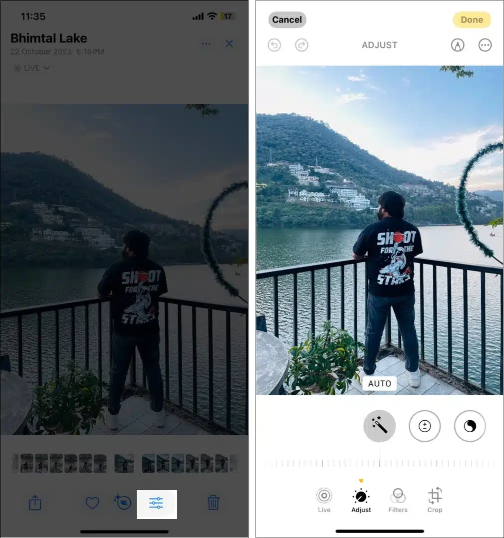 You can use the auto-enhance option here to have iOS adjust the image colors and tonality for you, or use the adjustment tools yourself to adjust photos manually. Here’s a list of all the adjustment tools you get in the Photos app: