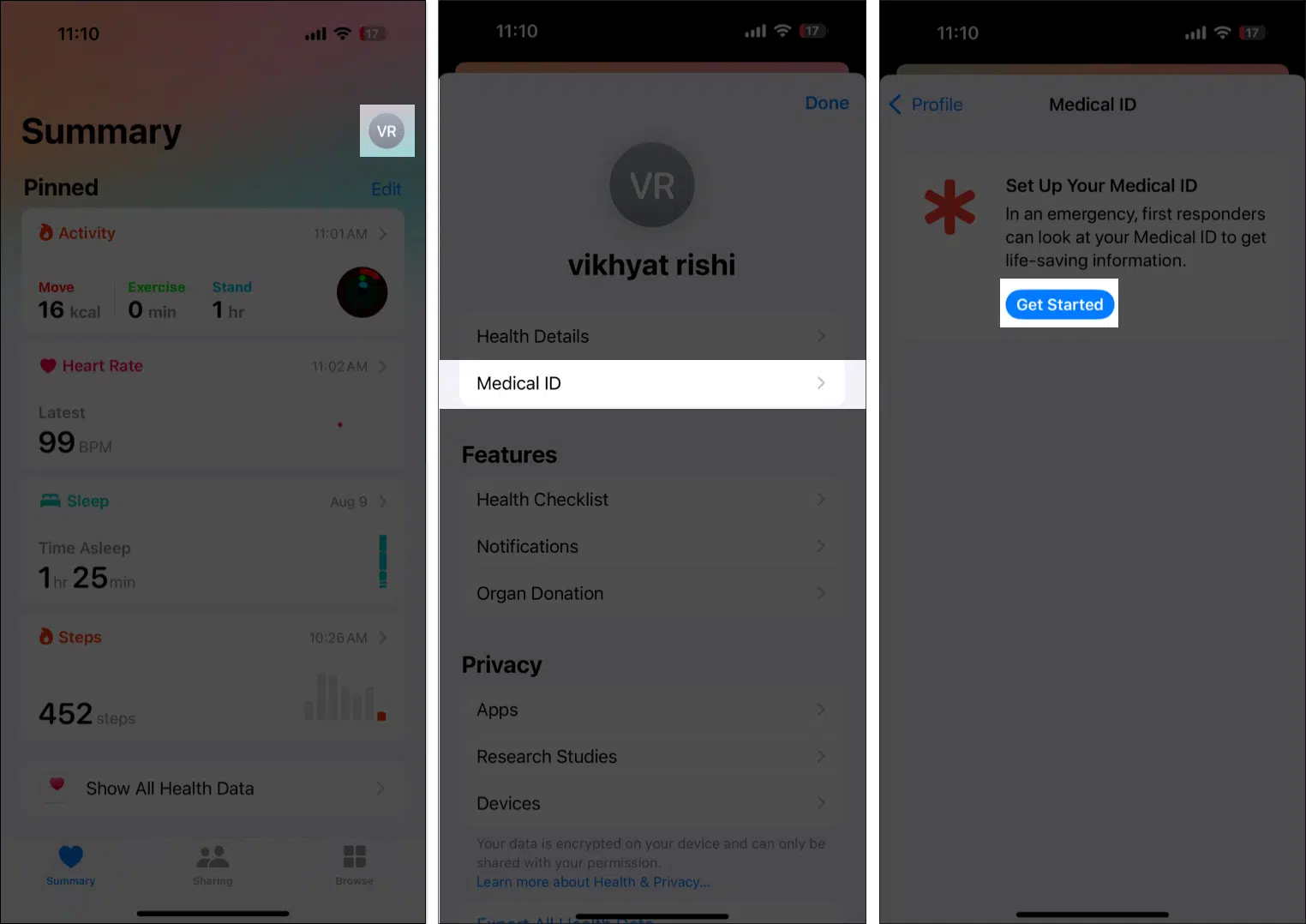 - Next, locate and tap on Medical ID, then tap the Get Started button on the subsequent screen.