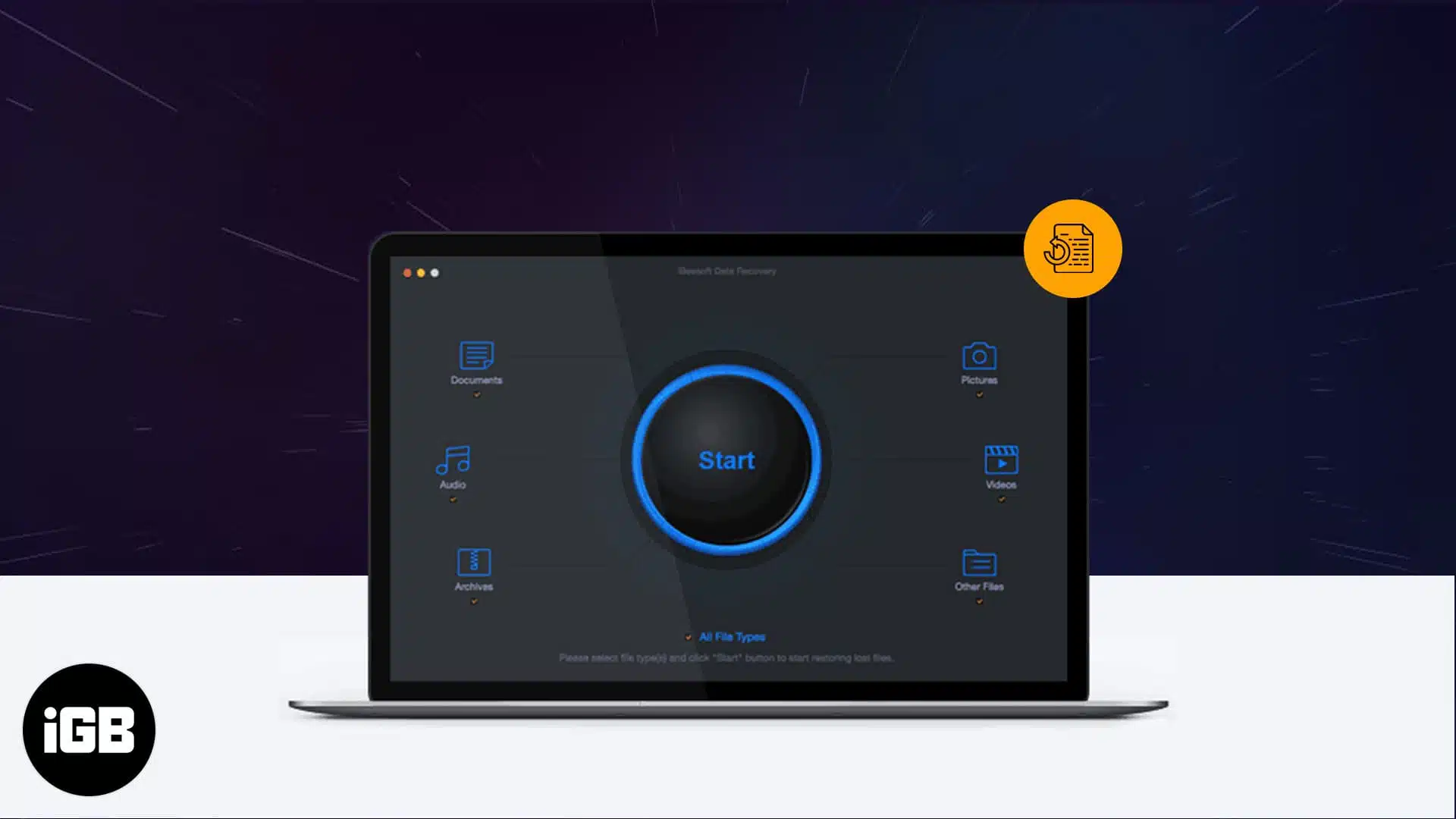 - Launch the iBeesoft Data Recovery app. The clean, simple first screen will greet you. By default, all file types are selected. But if you have a specific file type (like videos, audio, documents, etc.) for recovery, you should only check that box. This will accelerate the scanning process.