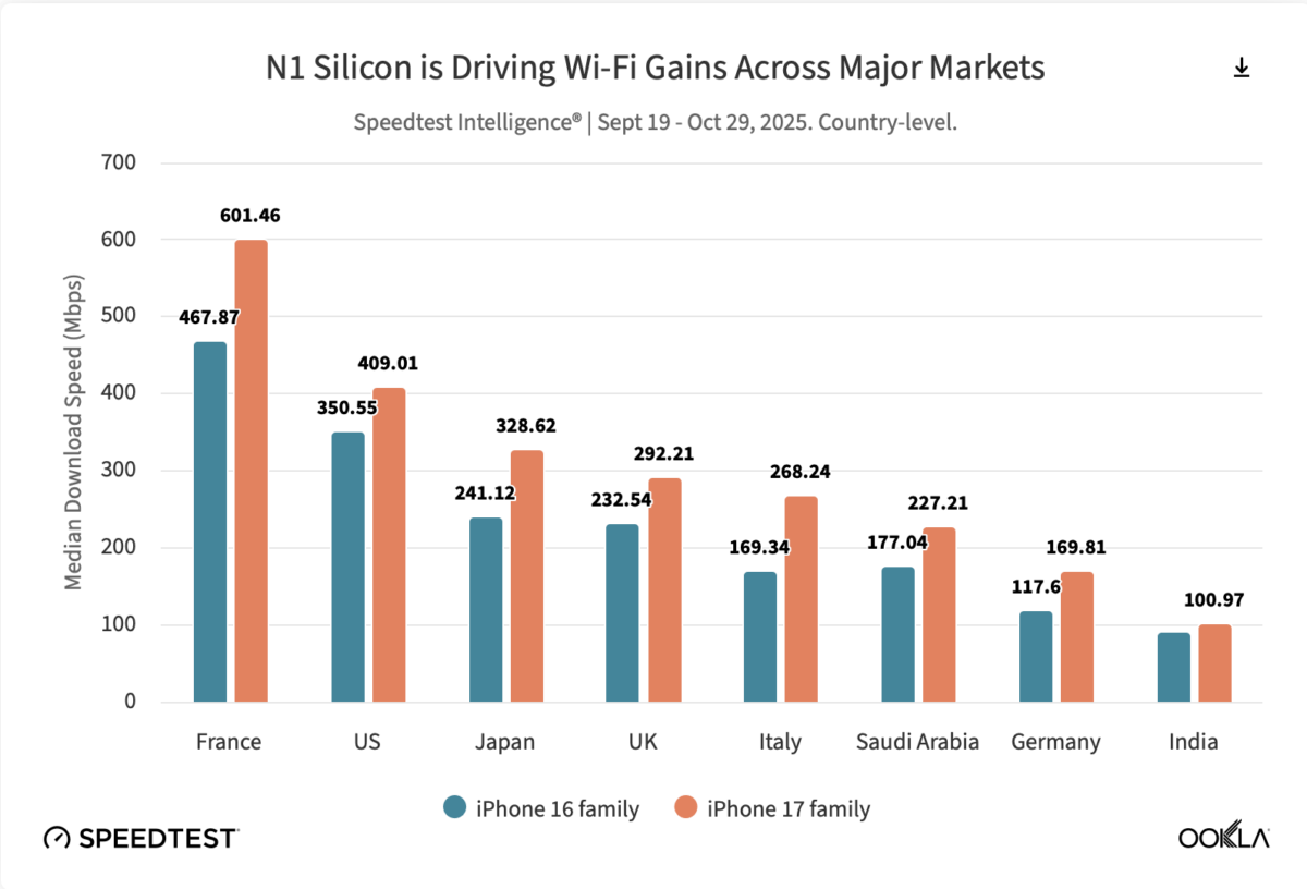 Ookla’s latest Speedtest data shows Apple’s new N1 chip gives the iPhone 17 lineup up to 40 percent faster Wi-Fi and noticeably smoother real-world connectivity compared to the iPhone 16 series.
