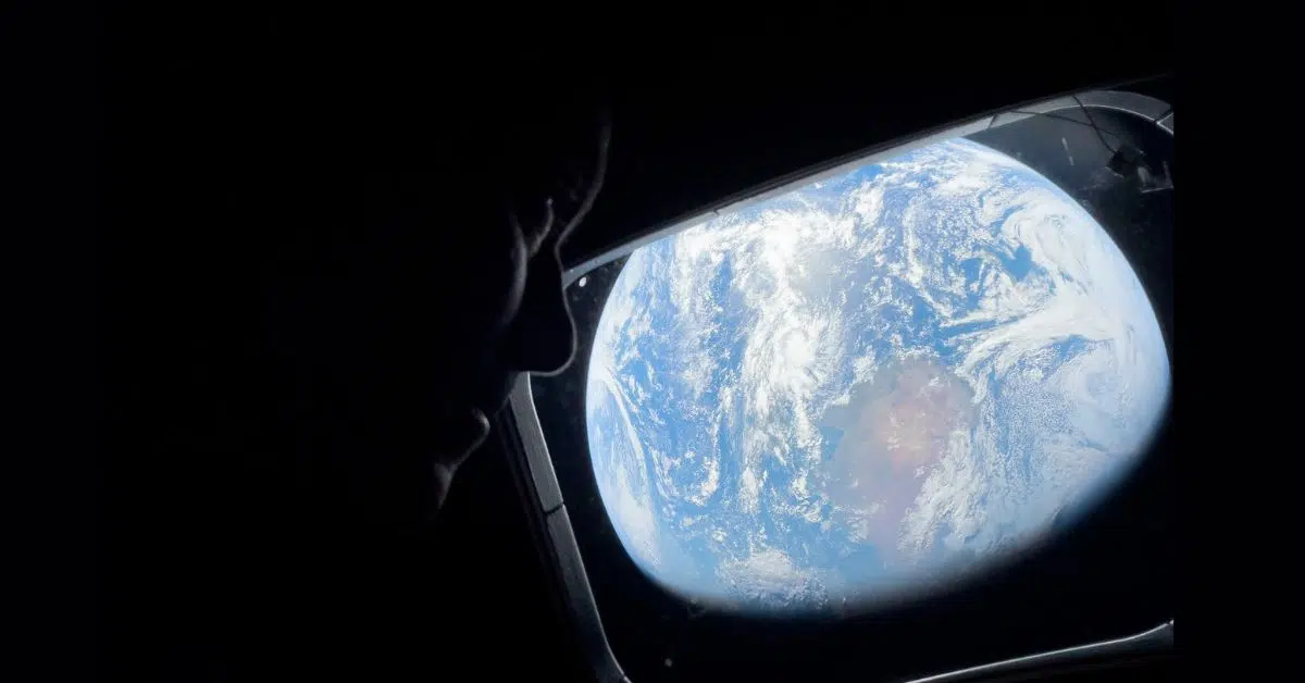The images show Commander Reid Wiseman and Mission Specialist Christina Koch looking back at Earth through Orion’s cabin window.